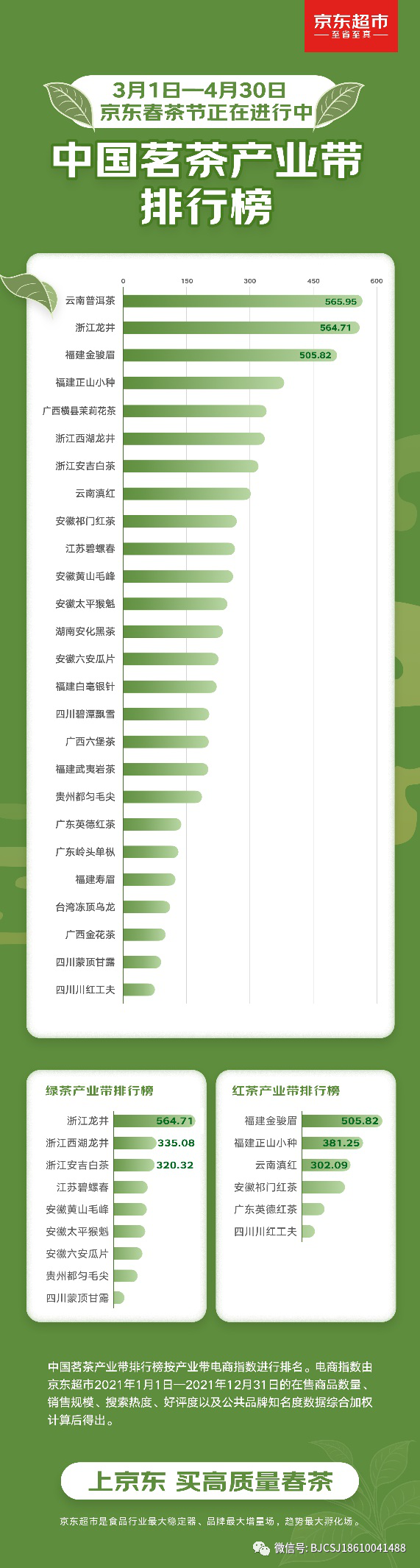 作为中国消费者信赖的商超购物首选平台,京东超市推出了首份茗茶产业带排行榜,该排行榜以2021年度京东超市的多项数据为依据,计算出各个茗茶产业带电商指数,据此进行排名。电商指数由该产业带在售商品数量、销售规模、搜索热度、好评度以及公共品牌知名度数据综合加权计算后得出。