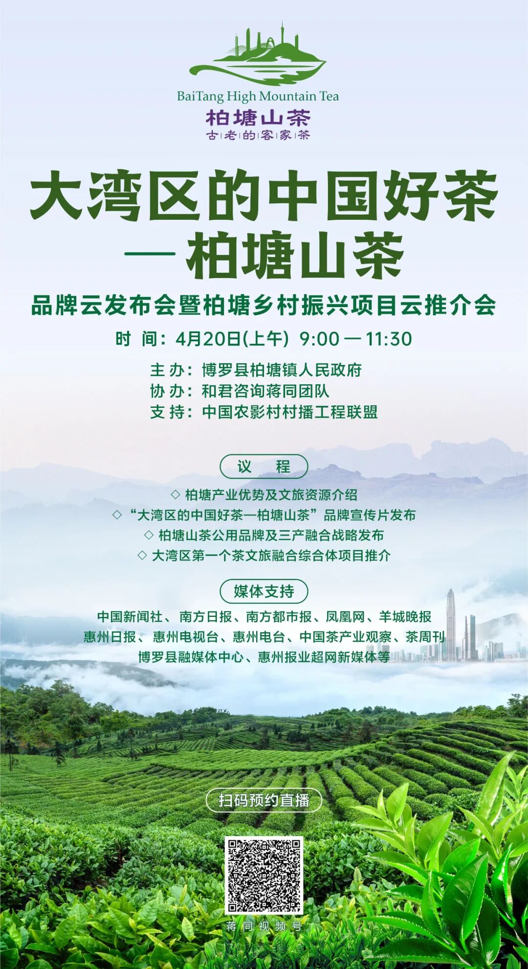 博罗县柏塘镇人民政府主办、和君咨询协同团队协办、中国农影村村播工程联盟提供支持的“大湾区的中国好茶—柏塘山茶”品牌云发布会暨柏塘乡村振兴项目云推介会将于2022年4月20日上午9时在博罗县柏塘镇高桥村古榄园举行。现场将云推介柏塘的产业优势及文旅资源,云发布柏塘茶文旅三产融合战略、山茶公共品牌形象及包装,云推介大湾区第一家茶旅融合综合体等项目推介,助力柏塘群众增收致富。