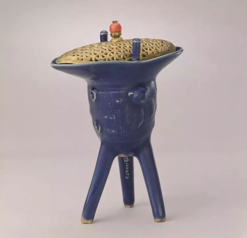 明代洒蓝釉器物较少,清康熙之后得到发展,质量和产量均有提高。雍正时期的洒蓝釉多模仿天然青金石的色泽,釉面有较浓重的青褐色,也有称之为“鬼脸青”的。至此之后洒蓝釉较少生产。