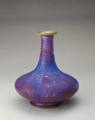 低温炉中烧成的钧釉,实际上是清代雍正时期景德镇窑一种仿宜钧的产品(宜钧,宜兴仿钧釉的产品,有天青、天蓝、芸豆、月白等品种,釉层较厚,开片细密,不甚透明,氧化气氛烧成。盛于明清),可分为素、荤两种,素者不见红点,荤者有红点。雍正时期炉钧釉泛有圈状红点,其红色并不鲜艳,红中泛紫,似刚成熟的高粱穗色,因此常称之为“高粱红”。