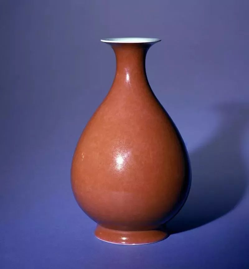 珊瑚红也是一种低温铁红釉,始于康熙,盛于雍、乾两朝。它是将红釉吹在白釉之上,烧成后釉色均匀、光润,能与天然珊瑚媲美,故名"珊瑚红"。
