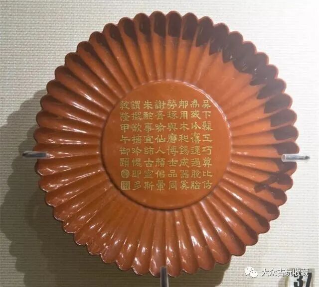 清乾隆 题诗珊瑚红釉菊瓣盘,南京博物院藏