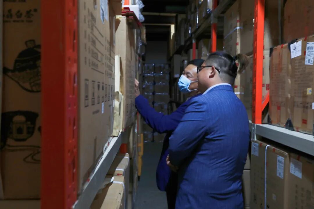 林雪涵老师首先带大家参观了和荼仓储中心,这里采用的是北方干仓特有的存储技术,24小时实时温、湿度调控,并采取无菌式货物管理,严格遵循消毒灭菌方式,同时为了不让茶叶受潮,叠放在高于地面十厘米不贴进墙面的货架上。
