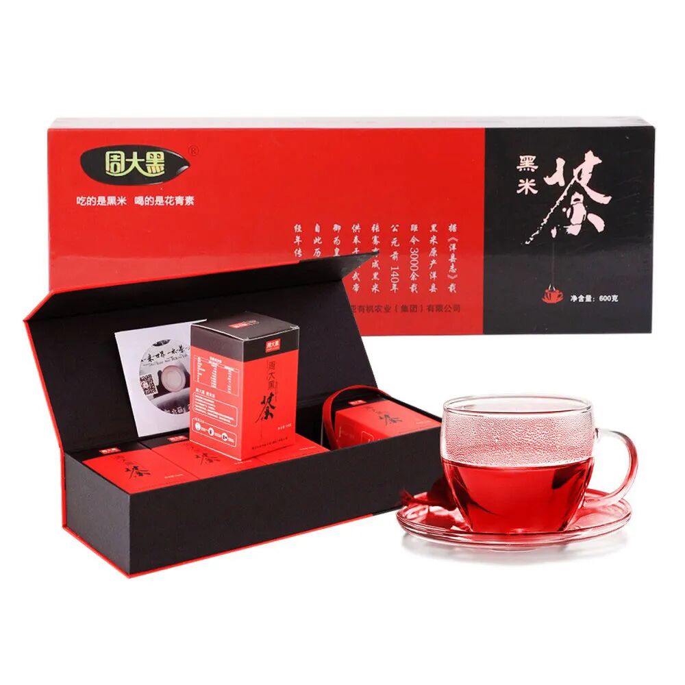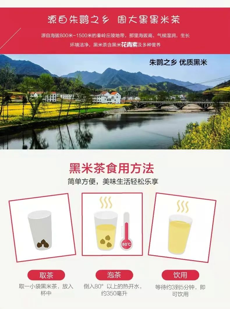 周大黑黑米茶是在传承茶文化的基础上,首开历史先河,以纯正洋县黑米为原料,将传统制作方式与现代科技完美融合,采用黑米茶发明专利技术精制而成。