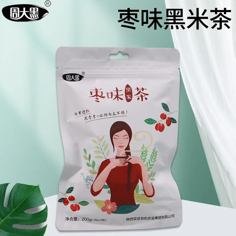 陕西双亚集团首开历史之先河,采用黑谷茶发明专利技术制成了周大黑黑米茶。由于独特的制作技巧,周大黑黑米茶保留了黑米中90%以上的花青素,营养价值得到更好的保留,更易于人体吸收。黑米茶冲泡之后,茶色清亮如红珀、茶香淡雅似幽兰、茶味甘醇在雨露。其具有美容、养颜、抗衰老强身健体之功效。食品学的科学家徐知名教授说:“一勺黑米糠比一勺蓝莓含有更多的花青素、纤维、维生素e,但是含糖量更低。”