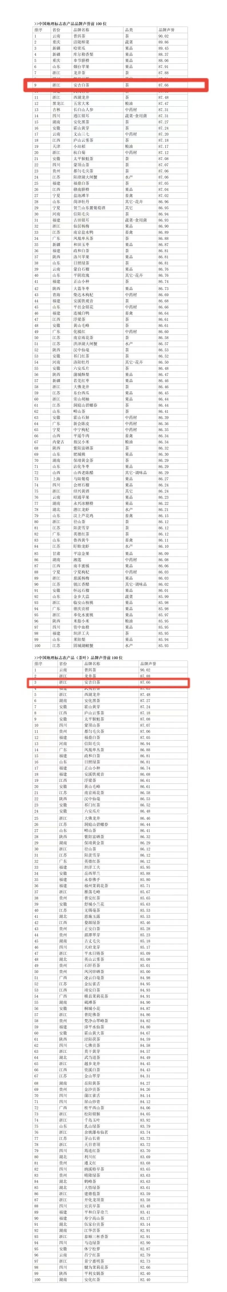 安吉白茶入选2021中国地理标志农产品品牌声誉榜TOP100 日前,浙江大学CARD中国农业品牌研究中心、浙江永续农业品牌研究院、浙江芒种品牌管理机构等联合组建的课题组发布了《2021中国地理标志农产品品牌声誉评价报告》。课题组选取了1471个获得中国农业农村部及原农业部、国家知识产权局(原工商局商标局、原质检总局)的两个及以上部门登记(或注册商标)保护的地理标志农产品品牌,开展了第二轮品牌声誉评价研究。其中,安吉白茶以87.66的品牌声誉入选总榜TOP100,位列全国第9位。 此外,与该报告一同发布的各类中国地理标志农产品品牌声誉排行榜中,安吉白茶高居全国茶叶类品牌声誉第3位。(点击图片查看大图)