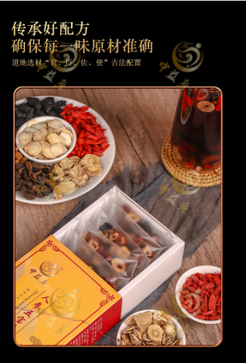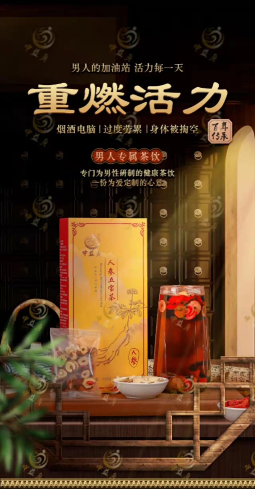 中益身人参五宝茶 根据“药食同源、药食同理、药食同用”的理论,精选天然药食同源食材,经严格筛选、科学组方,运用现代科学技术精制而成。喝起来口感清雅色泽浓郁。
