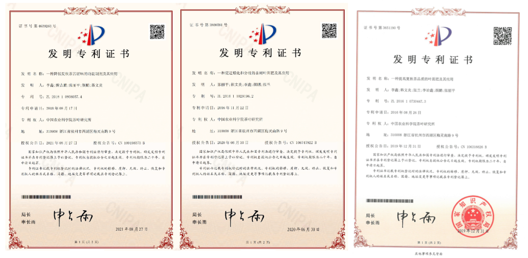 近年来,中国农业科学院茶叶研究所茶树生态栽培团队在茶树逆境响应和品质代谢调控方面取得了一系列研究成果。依托国家重点研发计划和浙江省重点研发计划等重大项目,目前已获得了一种提高夏秋茶品质的叶面肥及其应用(ZL7.3)、一种降低夏秋茶苦涩味的功能制剂及其应用(ZL7.4)、一种促进矮化和分枝的茶树叶面肥及其应用(ZL6.2)、一种防控茶园倒春寒的覆盖装置(ZL6.8)等国家专利。相关技术和产品成本低,应用方便,已在全国主要茶叶生产区进行试验示范。目前,相关专利可采用技术转让、专利许可实施等多种技术合作形式进行推广应用。