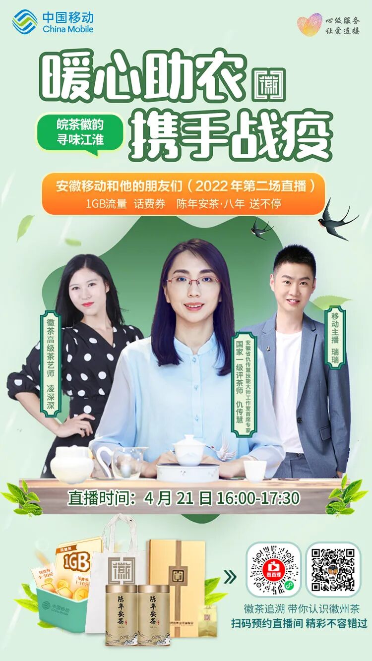 安徽移动联合徽茶集团,举行“暖心助农,携手战役”专场公益直播,带你追溯徽茶,认识徽州茶,记得扫码预约下方直播哦~