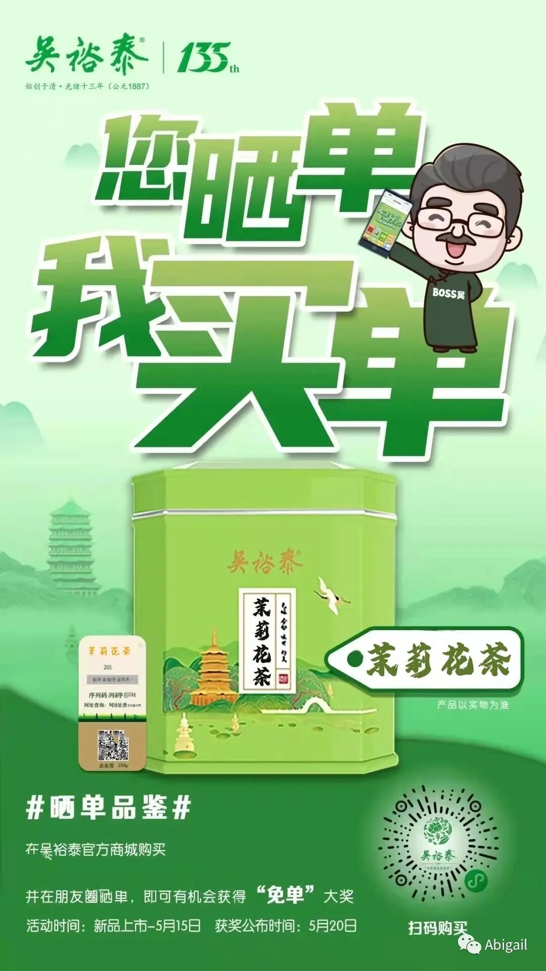 凡于活动期间在吴裕泰官方商城购买50g茉莉花茶,参与朋友圈晒单活动,将有机会获得“免单”名额。