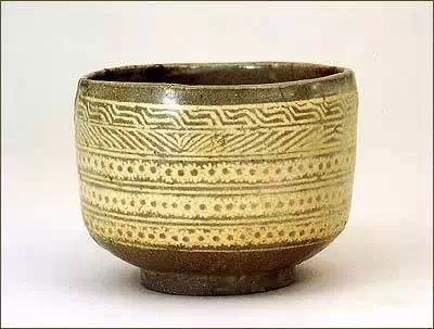 26.黄瀬戸茶碗从十六世纪末至十七世纪初,美浓国可儿郡久久利村附近的濑户系大窑所烧制的茶碗。多为碗上涂有淡黄色的釉药,以及附有铜绿色的斑纹和刻线纹或胴线。现藏于日本爱知县陶瓷资料馆。