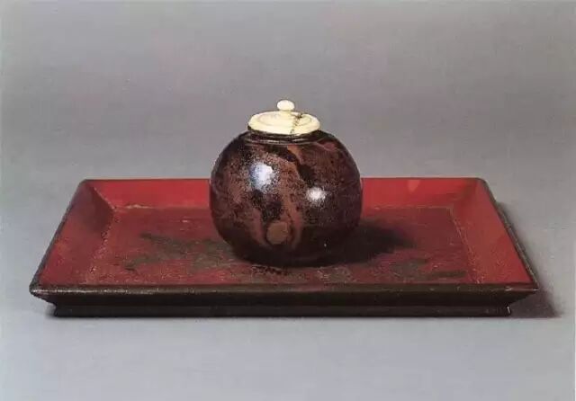 29.大海茶入汉作唐物茶器,柿红底色上浮起黑色的阴云纹理,足利义政因此而命名。经过足利义政、丰臣秀吉、京极家之手,后为德川将军家所有。一般来说,注口宽体积大而扁圆的茶入被称为「大海」,此茶具又称“打云大海”。现藏于爱知县陶瓷资料馆。