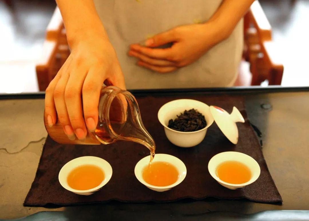 ⑤关公巡城(倒茶):把泡一、二分钟后的茶水依次巡回注入并列的茶杯里。