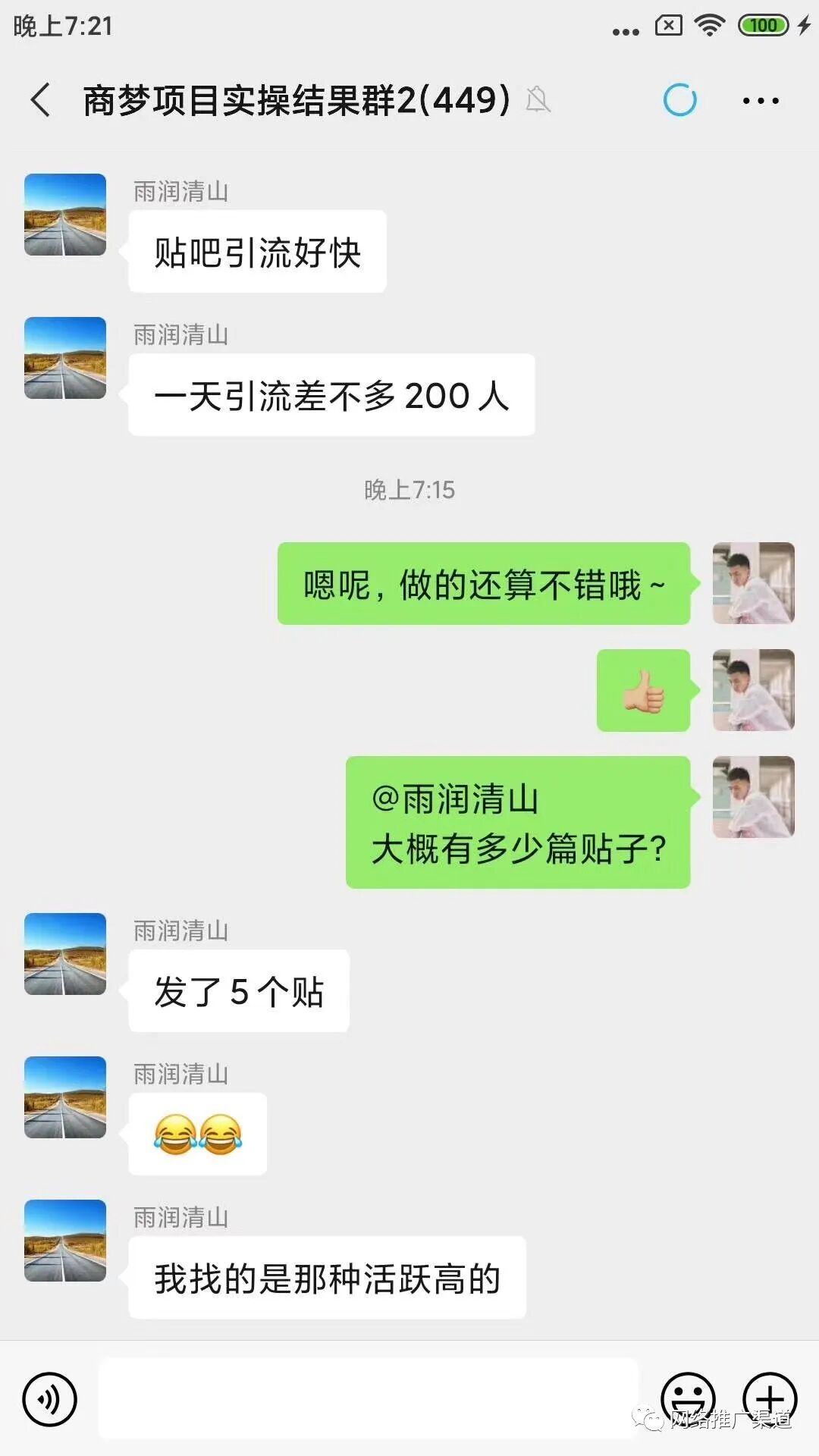 最近很多小伙伴和我反馈说找不到客户,也不会推广获客,说能不能让我带带大家?说实话,一对一带难度太大了,毕竟精力有限。因为没办法一对一的教大家,所以我最近建立一个yin liu 训练营的社群,在社群里面我会定期免费分享适合大部分行业的推广获客方法,通过直播的形式现场实操,并且这些方法是公益分享的,无论你做什么行业,操作任何的项目,分享的这些推广获客技术都是适用的。目前已经整理了18种方法,比方说知乎推广、推广、问答营销、抖音推广、视频号推广、闲鱼推广、音频推广、百度霸屏、广告投放、视频营销、贴吧营销等外面绝对学习不到的核心技术,利用这些方法每天搞几十上百个精准客户是根本不是问题。这是咱们群里其中一些小伙伴操作的结果!