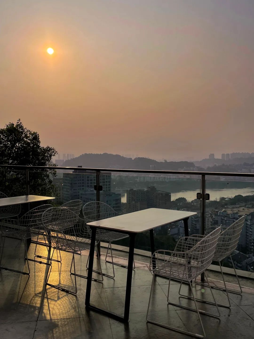 天色渐暗,日落把四处渲染得金黄,就连远处的楼房都在各自泛光,城景一览无余,好生舒爽。一直向上走,再转几个弯,就到了茶馆。