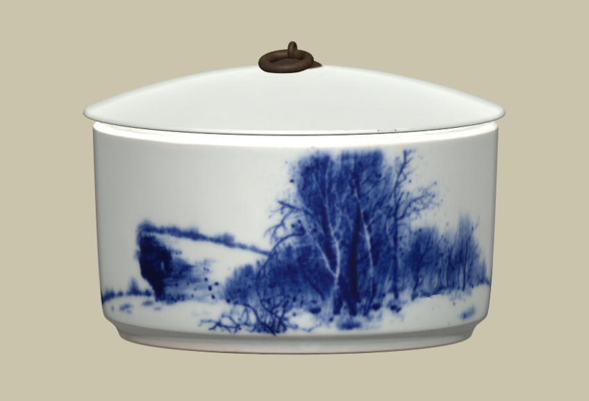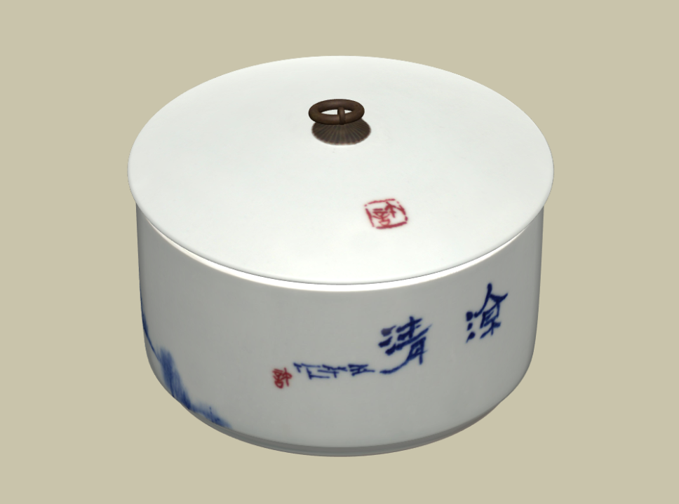 此作品采用青花泼墨技法,整体画面落笔大胆,色调简约,给人一种清净悠远、怡然自得的山水艺术体验。