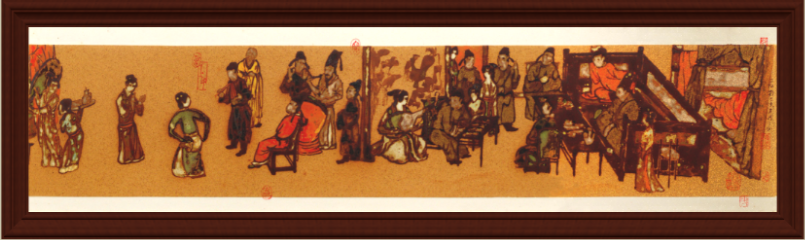 《韩熙载夜宴图》是中国画史上的名作,以连环长卷的方式描摹了南唐官宦韩熙载家开宴系列的场景,用高温色釉表现古画神韵。