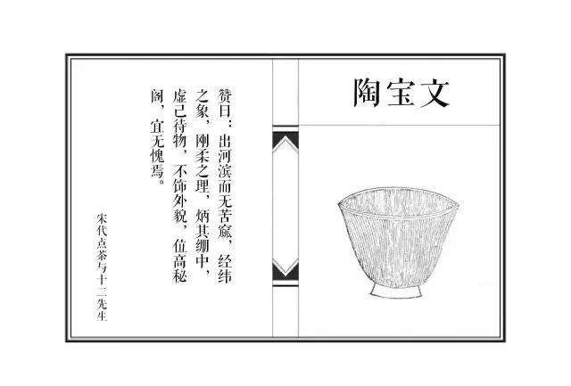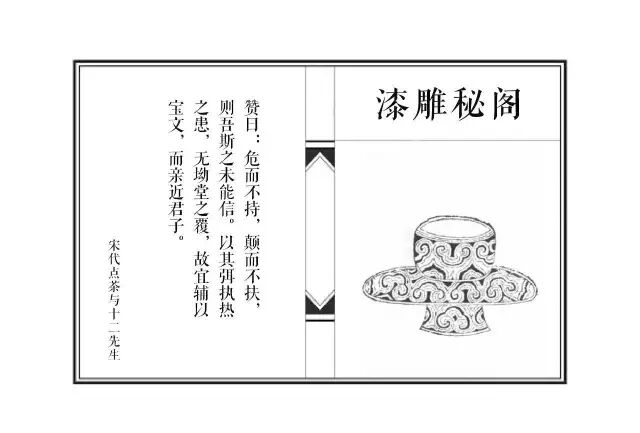 赞曰:危而不持,颠而不扶,则吾斯之未能信。以其弭执热之患,无坳堂之覆,故宜辅以宝文,而亲近君子。宋代盏托多木制,大概取其隔热与轻便。从辽墓壁画来看,茶托施漆,且常以红黑二色。“漆雕”是一种工艺。南宋时期,漆雕中有一种工艺称为“剔犀”,是用两 种或三种色漆在器物上有规律地逐层积累起来,至相当厚度,趁漆未干是用刀剔刻出云钩、香草等图案花纹,在刀口断面上可以看见不同的色层。从《茶具图赞》中 的盏托图来看,布满黑白相间的云纹,是一件漆雕盏托。盏托以漆雕故姓“漆雕”。秘阁指尚书省,又可指皇家藏书馆。阁、搁同音,故爵以秘阁。盏托以承搁茶盏,方便端用,故名“承之”,字“易持”,号“古台老人”。9 陶宝文——即茶盏,用以点茶喝茶