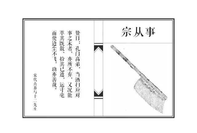 赞曰:几事不密则害成,今高者抑之,下者扬之,使精粗不致于混淆,人其难诸!奈何矜细行而事喧哗,惜之。罗筛,以罗为姓。枢密是枢密使的略称,掌军国机密要务。茶罗绢纱细密,与枢密谐音。茶罗如同要塞一般,分出茶粉药谐音要,故名“若药”。茶罗分拣茶粉,筛选其中大小,正如教师,故字“傅师”。又号“思隐寮长”,思与细同音,茶罗为细筛,细者皆能隐没其中,茶罗分管茶粉,能过着方能成茶,如同寮长。蔡襄《茶录·茶罗》:“茶罗以绝细为佳。罗底用蜀东川鹅溪画绢之密者,投汤中揉洗以幂之。”7宗从事——即茶刷,用以扫集残茶