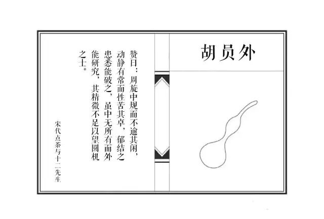 赞曰:抱坚质,怀直心,啖嚅英华,周行不怠,斡摘山之利,操漕权之重,循环自常,不舍正而适他,虽没齿无怨言。茶磨以石为之,故即以石为姓。转运乃“转运使”的略称,原是宋代地方行政——路的长官,如蔡襄曾任福建路转运使。转运取义于茶磨的运转功能。磨必有齿,故名“凿齿”。磨的工作是不停地旋转,故以“遄行”为字。以石屋喻石磨,香茶出自石磨,故号“香屋隐君”。苏轼在《次韵黄夷仲茶磨》诗中写道:“前人初用茗饮时,煮之无问叶与骨。浸穷厥味臼始用,复计其初碾方出。计尽功极至于磨,信哉智者能创物。”可见茶磨的使用功能。5胡员外——即茶瓢,舀水器