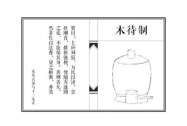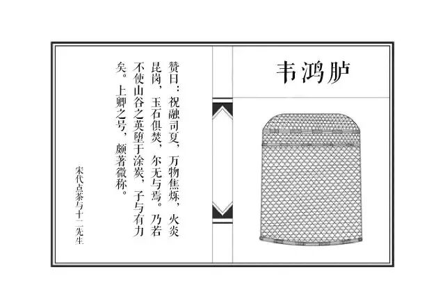赞曰:祝融司夏,万物焦烁,火炎昆岗,玉石俱焚,尔无与焉。乃若不使山谷之英堕于涂炭,子与有力矣。上卿之号,颇著微称。古代竹简多用“韦编”,即用皮绳编连竹板,故以“韦”为姓。又因茶焙乃编竹围盖之,取“韦”为姓,谐音“围”。鸿胪原为掌朝庆贺吊之官,这里取其与“烘笼”、“烘炉”音近。茶焙炉火常温,故名“文鼎”,意为文火之炉。又字“景旸”,旸为日出,取意始温。茶焙为编,四围满布孔隙,故号“四窗闲叟”。蔡襄《茶录·茶焙》:“茶焙编竹为之,裹以箬叶,盖其上,以收火也。隔其中,以有容也。纳火其下,去茶尺许,常温温然,所以养茶色香味也。”2木待制——即茶搥,用以捣碎茶饼