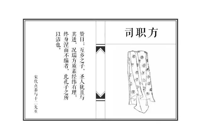 赞曰:互乡之子,圣人犹且与其进,况瑞方质素经纬有理,终身涅而不缁者,此孔子之所以洁也。茶巾以丝或纱织成,丝、司同音,故以司为姓。职方源于《周礼》之官,宋代尚书省所属四司之一。职谐音织,方指方巾,丝织方巾,故爵以职方。因其功能在于拭净茶具,拭、式同音,故名“成式”。又因其素朴,故字“如素”。茶巾供清洁茶具用,故号“洁斋居士”。