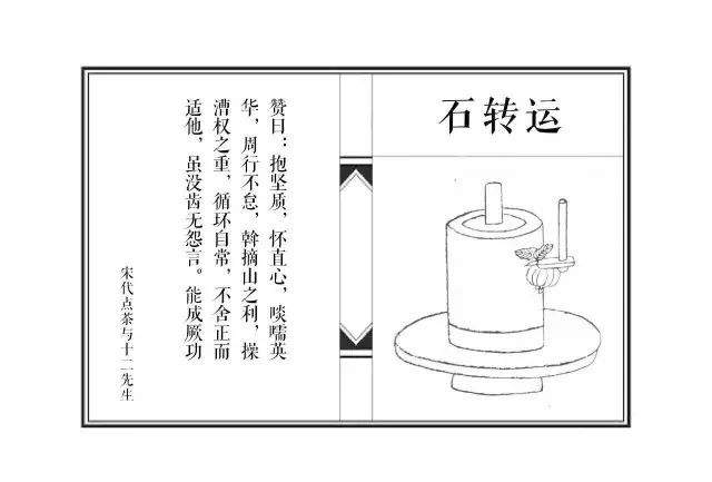 赞曰:柔亦不茹,刚亦不吐,圆机运用,一皆有法,使强梗者不得殊轨乱辙,岂不韪欤?茶碾以金属制成,故以“金”为姓。法曹是司法官吏,掌刑狱讼事。茶碾由碾槽和碾轮构成,《大观茶论·罗碾》:“凡碾为制,槽欲深而峻,轮欲锐而薄”。爵以 “法曹”,是因为曹、槽同音。其名“研古”、“轹古”,取义于碾轮的碾轧。其字“元锴”,锴为好铁,元锴喻铁制圆碾轮。又字“仲铿”,铿乃象声词,仲铿取义于碾茶时的声音,所以其号有“和琴先生”。蔡襄《茶录·茶碾》:“茶碾以银或铁为之。”《大观茶论·罗碾》:“碾以银为上,熟铁次之,”茶碾之用已见于唐代的煎茶,法门寺地宫出土文物中便有一只鎏金银茶碾。4石转运——即茶磨,用以将出碾的茶末磨成粉
