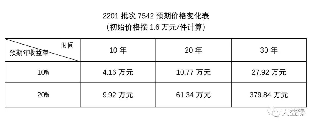 再假如我们现在收藏了2201批次的7542,按照当前行情价16000计算,按照以上的收益算法,10年,20年,30年后的价格表现如下图:
