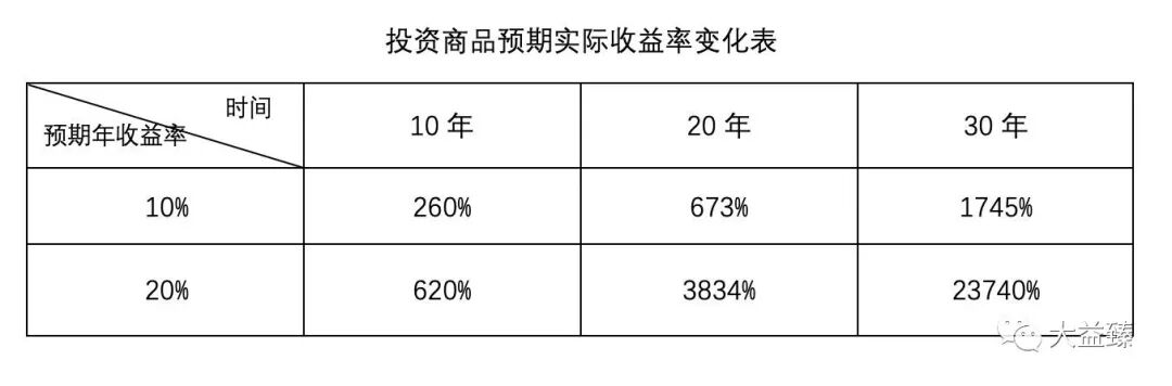 对于大益茶的长线投资,彭总提醒大家不要贪欲过重,每年没有个百分之几十到几倍的回报就骂娘,这种浮躁的心理不会成就你做好投资。彭总说,真正的投资回报很高的,一般人是做不到的,只有巴菲特能做到。而巴菲特除了有超级的投资理念外,更有充实的资本和庞大的投资团队。彭总做的一个分析很有意思:一个投资项目,如果能持有十年,二十年,三十年,按照年收益率10%、20%,其最终收益如下图: