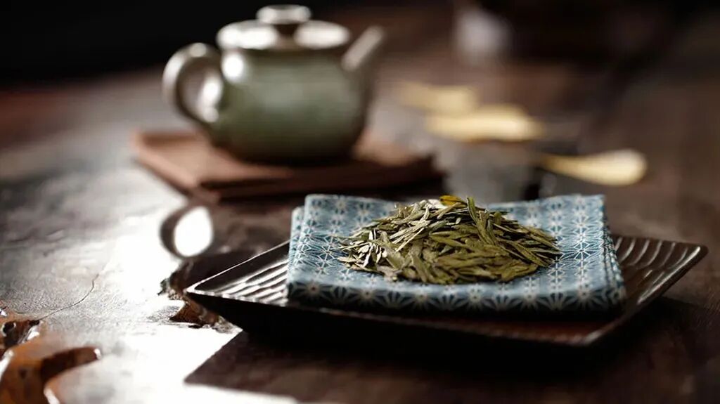 “越窑是我国最著名的青瓷窑系。唐代诗人陆龟蒙盛赞其‘九秋风露越窑开,夺得千峰翠色来’,可见越窑在唐代时期的兴盛与巅峰。嵇大师在多年研究的基础上传承非遗制作技艺,却不因循守旧,在复原中加以创新,真是令人钦佩。”宋教授感慨地说。正在众人观赏越窑青瓷牡丹刻花盘的同时,简老师拿出一只小四方锡制茶叶罐,罐体上錾刻着清幽雅竹,俊秀挺拔。“这是非遗抬凿錾刻艺术传承人姚士荣先生赠与的茶叶罐,大家看看今日茶会我们要品鉴的是哪款非遗茶。”说罢,双指用力,打开罐盖,用茶匙将茶叶放到茶荷之中。(西湖龙井 中国茶叶的一张名片)