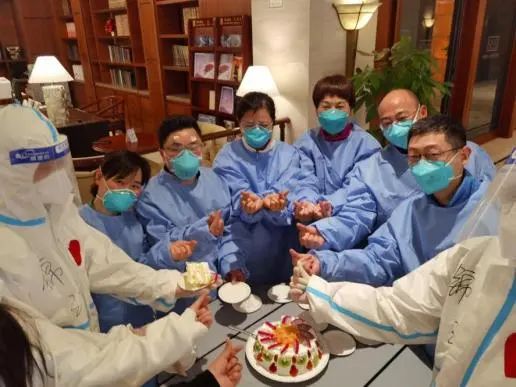 疫情无情,人有情。在面对这场生与死的严峻斗争中,我母亲及单位同事们用实际行动证明自己的责任、担当和使命。他们竭尽全力地做好安徽省援沪医疗队的食宿保障服务。细心的总台接待员在医护登记入住时,就挨个记下队员的身份证号,早早地谋划着为过生日的队员准备蛋糕。4月5日正逢亳州医疗队王医生的生日,厨师们早早起身,赶制精美的生日蛋糕。当委婉动听的生日祝福歌响起时,队员们惊喜万分,纷纷做出比心的手势。援沪医疗队员能够心无旁骛的投入到战“疫”工作中,离不开他们对抗疫情的决心,也离不开无微不至的后勤保障。