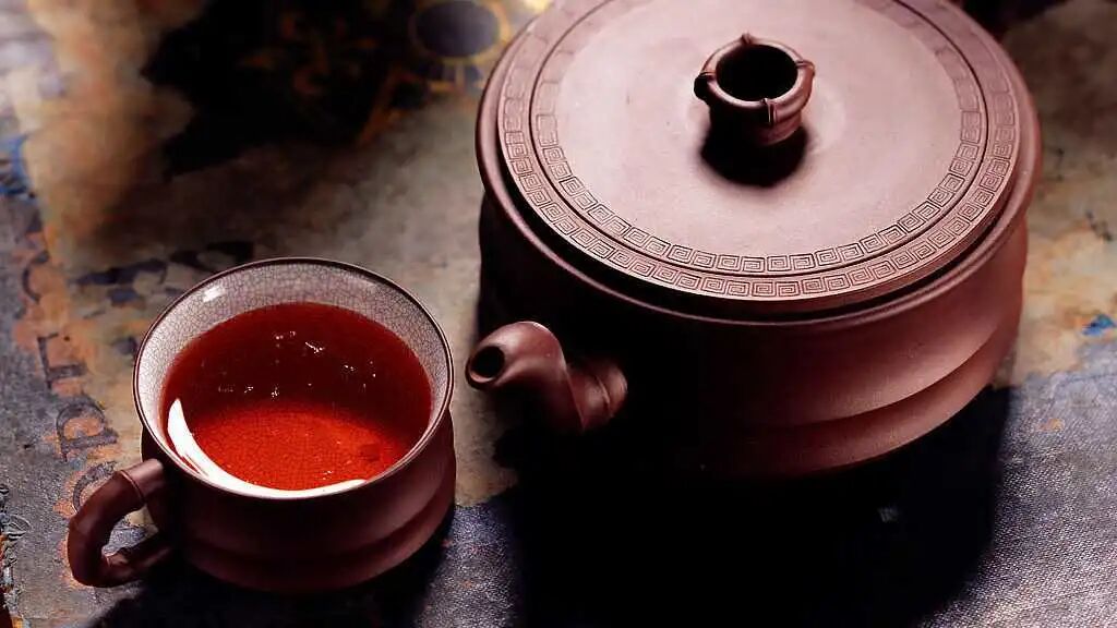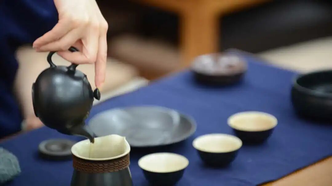 紫砂壶泡好茶后,在茶巾上沾干壶底的残水,并把茶水注入公道杯内,此过程就叫"游山玩水,慈母哺子"。
