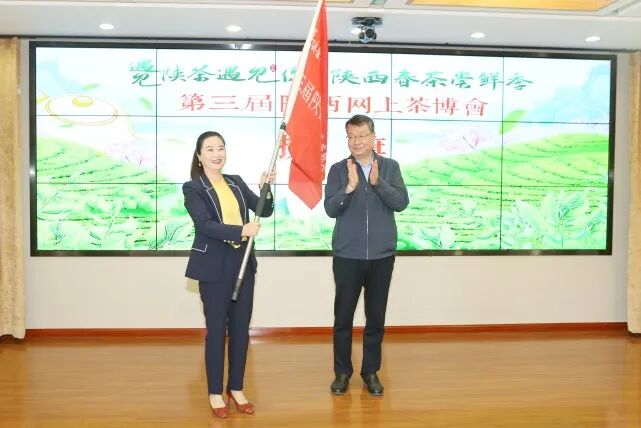 陕西省农业农村厅副厅长、省茶产业链链长王韬向第三届陕西网上茶博会产区探访团授旗。