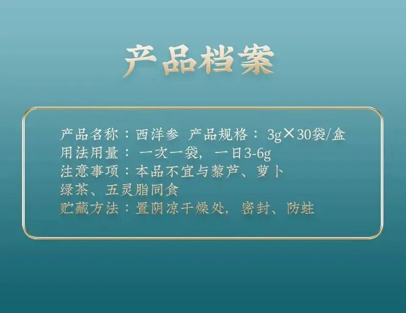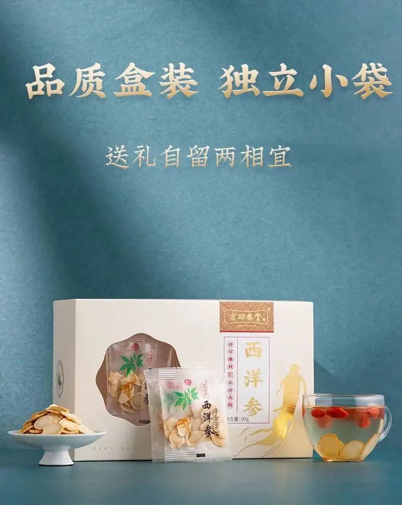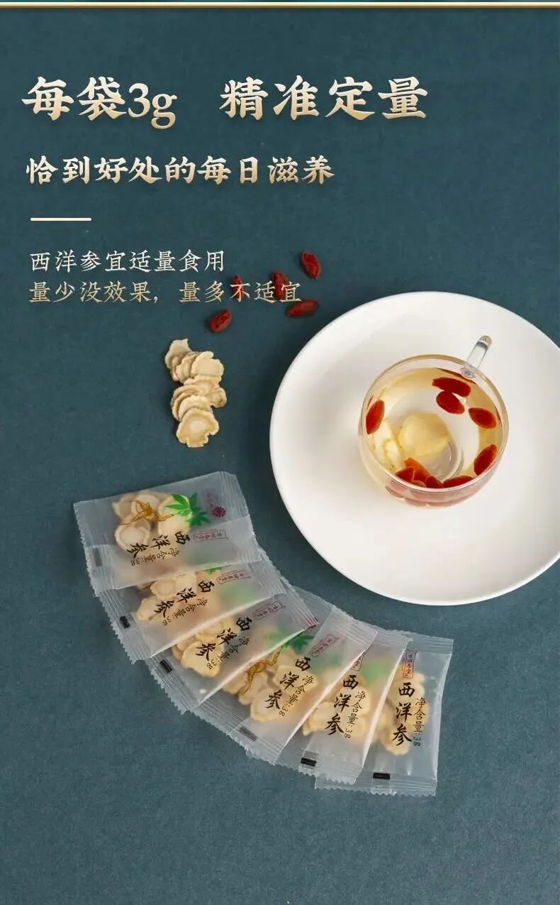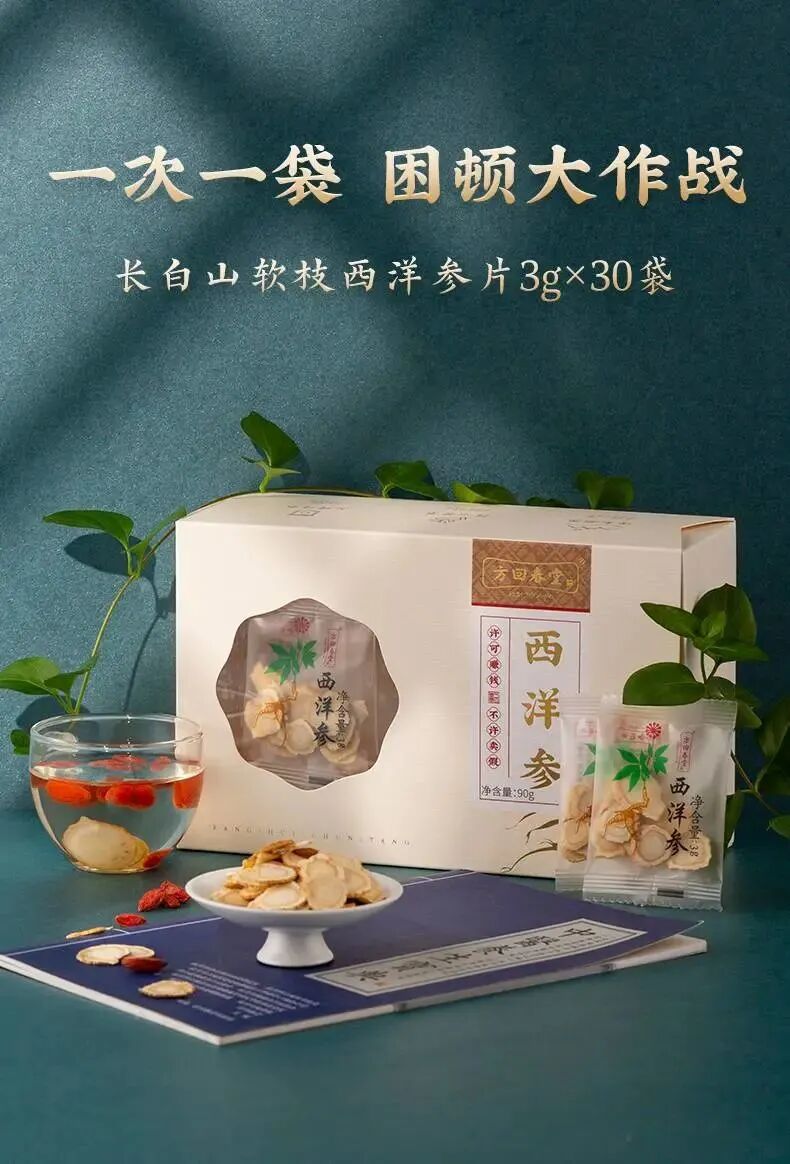 西洋参食用计量以每日3~6克为宜。不用担心吃多或吃少,方回春堂西洋参片每袋3g精准计量、独立包装。一盒30袋,方便日常携带,或与家人朋友共享健康。
