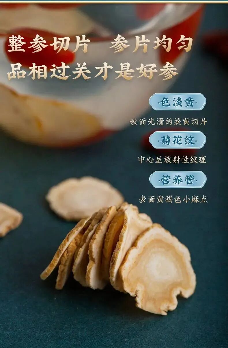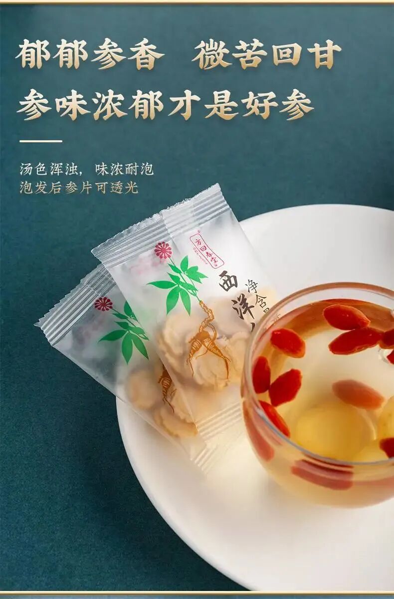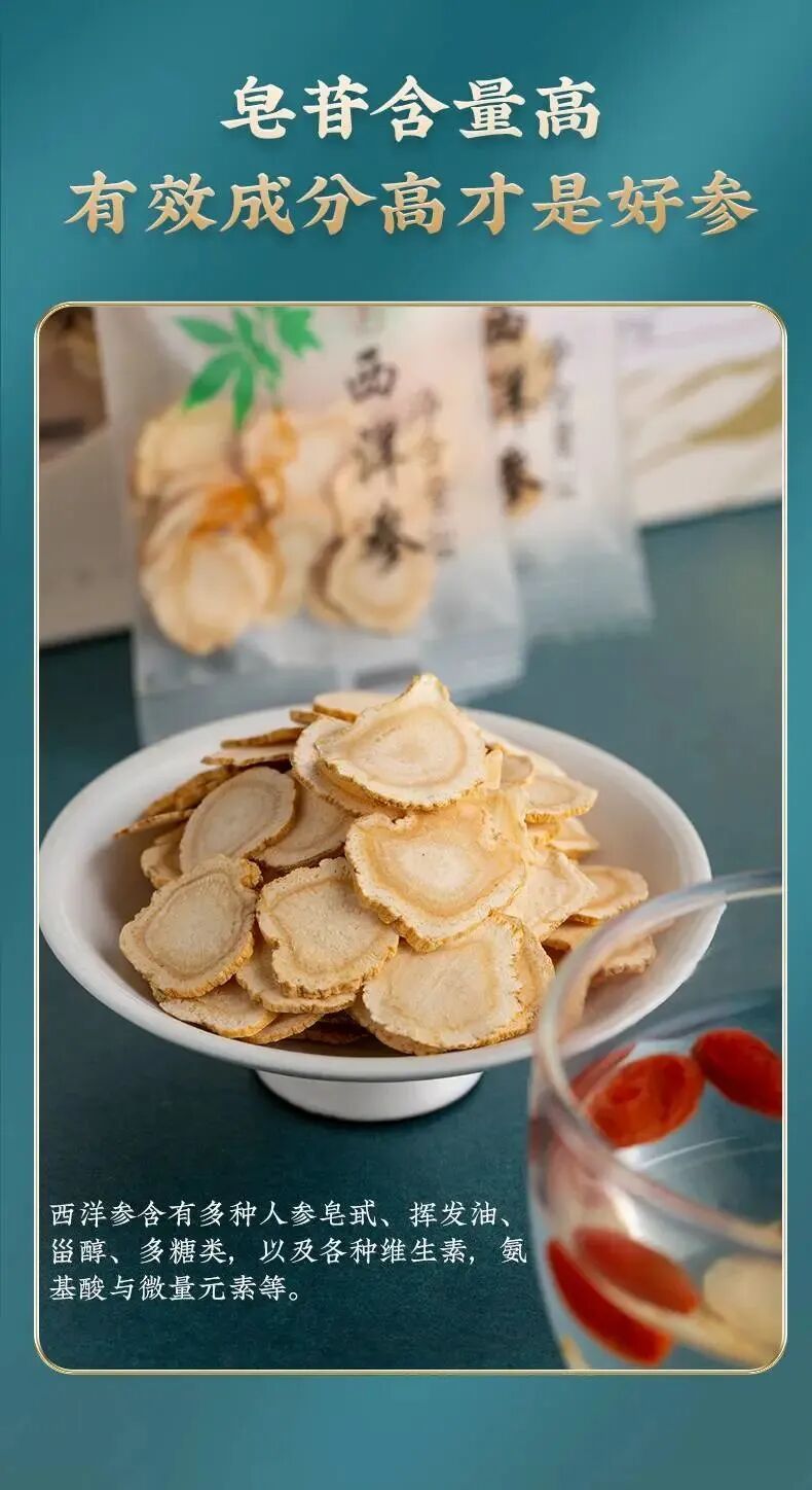 甄选西洋参薄片,切片平整,平滑细腻,参片大、参香浓,方便含服或泡茶饮,皂苷更容易释放。