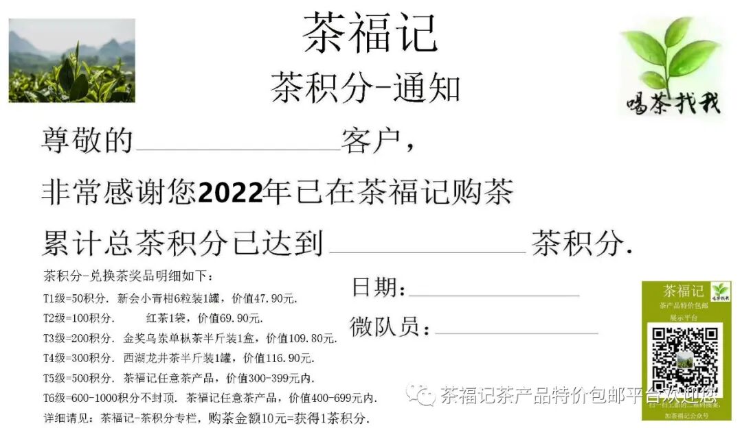 凡在2022年1月1日-12月31日,购茶福记茶产品获得的茶积分只要达到T1-6级可以随时兑换茶奖品.