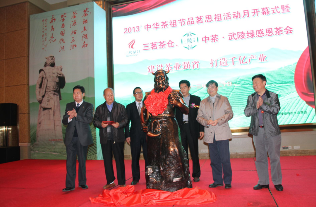 2013年4月20日,2013中华茶祖节今天在长沙开幕。三湘茶人品茗思祖,弘扬茶文化,促进茶消费,共推湘茶迈向千亿产业。本届茶祖节活动,由省委农村工作部、省农业厅、省供销合作总社、湖南日报报业集团主办,省茶业协会、省茶叶学会、茶祖神农基金会联合承办。400多名与会茶界人士品茗闻香,共话千亿茶产业。“中茶·武陵绿”、“中茶·古丈毛尖”、“桃源野生大叶”等名优茶让人赞不绝口。武陵山区的产茶大县桃源、石门分别介绍了茶业发展的情况。湖南茶业异军突起,据相关统计,2012年全省茶园面积170万亩,产量15万吨,加工销售各类茶叶41万吨,占全国茶叶总量的三成以上;湘茶出口创汇也首次突破1亿美元。开幕式上,还举行了三茗茶仓和“中茶·武陵绿”感恩茶会、湖南商务职业技术学院湘茶学院授牌仪式等。本届茶祖节还举办了“湖南魅力茶仙子”选拔赛等多项茶事、茶文化活动。