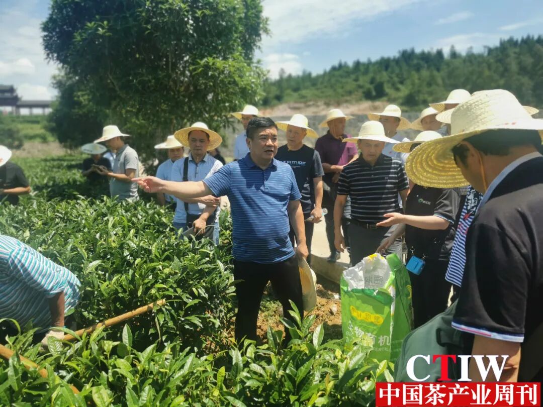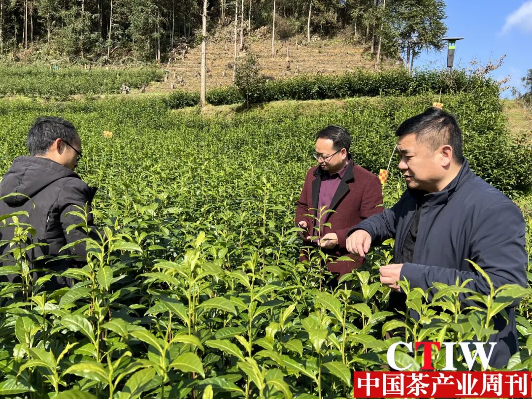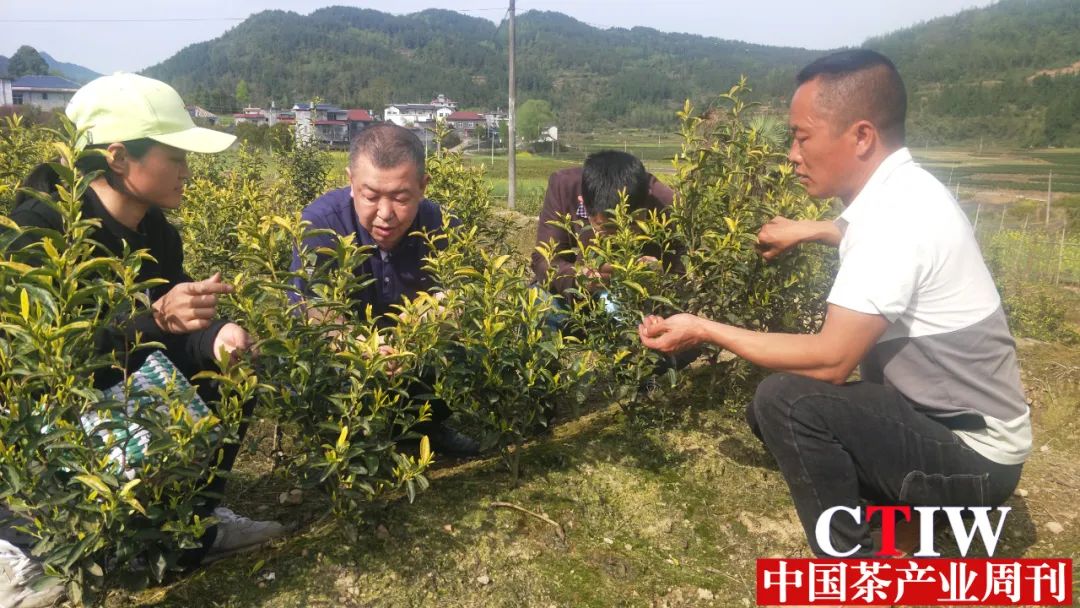 湘西自治州茶叶协会会长潘春新(右一)、湘西自治州农科院茶叶研究所所长彭云(右二)在茶叶基地指导茶农培管。