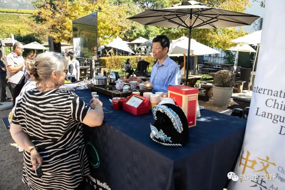4月19日,南非西开普大学中医孔子学院在赫罗特康斯坦蒂亚酒庄举办中国茶文化活动,与到场游客共同庆祝联合国中文日。孔子学院当天准备了绿茶在内的五大类中国茶,现场为中外游客沏茶。教师们还向游人介绍茶的知识和孔院语言教学等活动。展台旁悬挂着多件中国民族服装,让游客感受中国民族文化。