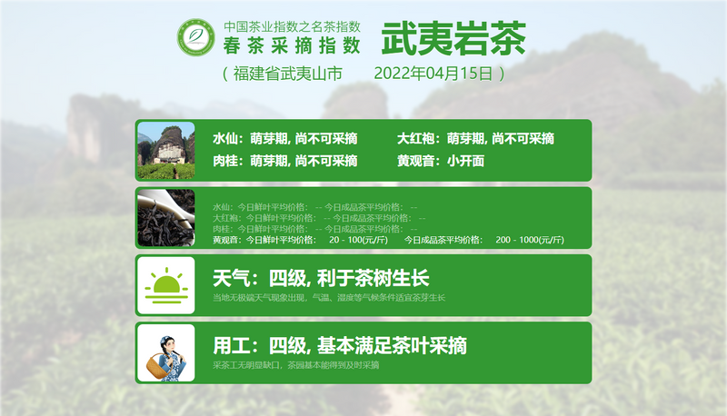 为引导广大茶叶消费者科学、安全、理性选购,切实保护名茶原产地生产者和广大消费者的利益,中国茶叶流通协会于2022年继续联合杭州市西湖区龙井茶产业协会等9大名茶产区主管单位,于即日起共同发布中国茶业指数之名茶指数——春茶采摘指数(简称:春茶采摘指数)。包括西湖龙井、洞庭山碧螺春、黄山毛峰、信阳毛尖、六安瓜片、太平猴魁、湄潭翠芽、大佛龙井与武夷岩茶。