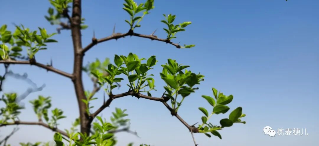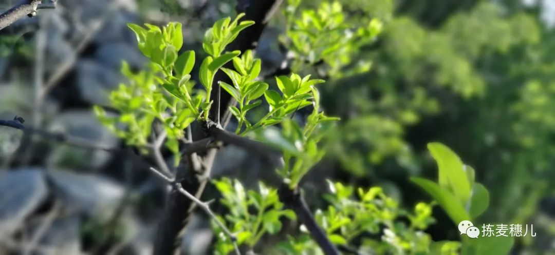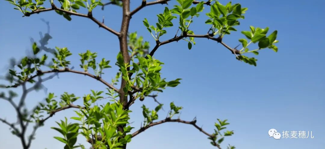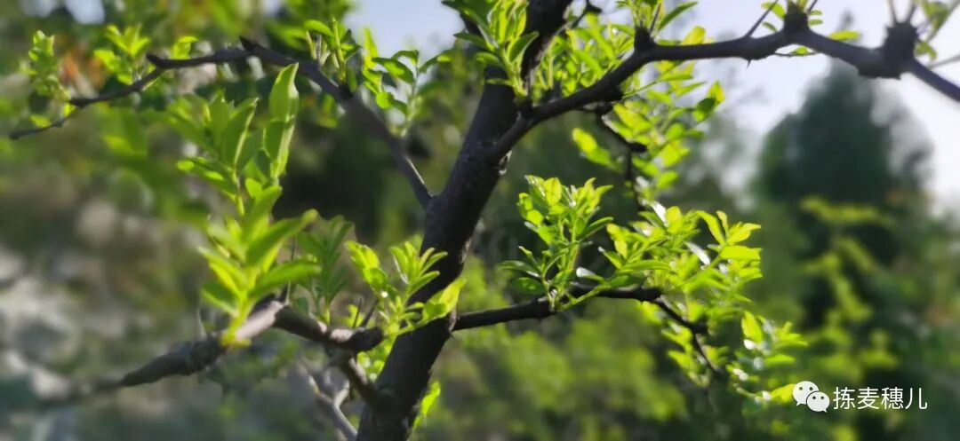 这里有几棵酸枣树,在太阳的照射下,嫩绿的酸枣芽闪闪地发光,真美呀!