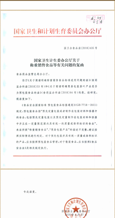 你厅《关于商请明确称重销售食品标准适用问题的函》(食药监办科函〔2016〕53号)和《关于商请明确简易包装茶叶产品是否为预包装食品的函》(食药监办科函〔2016〕64号)均悉,经研究,现函复如下: