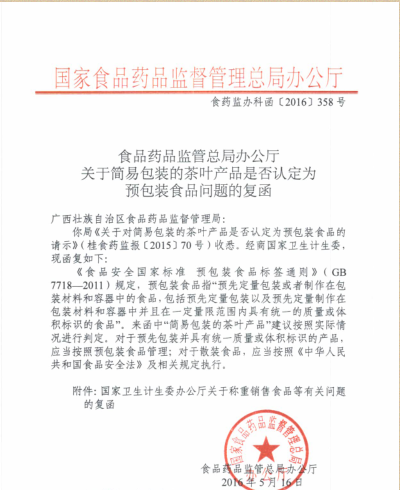 关于简易包装的茶叶产品是否认定为预包装食品问题的复函