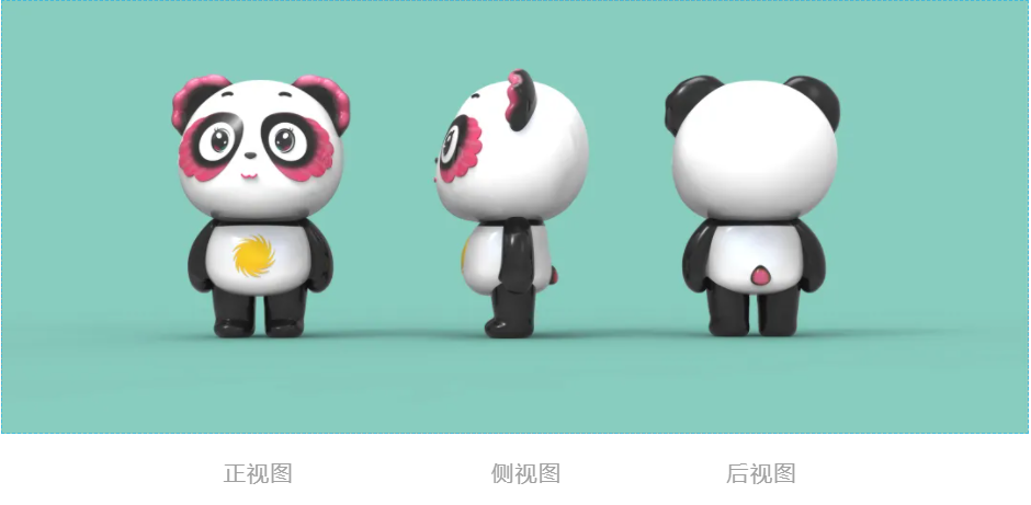 “大熊猫”IP造型主体由国宝熊猫与市树“银杏叶”“银杏果”、市花“芙蓉花瓣”元素和金沙太阳神鸟元素融合,主要采用黑色、白色和“银杏黄”“芙蓉红”色彩构成,符合绿色生态的定位,形成可爱卡通的大熊猫造型。