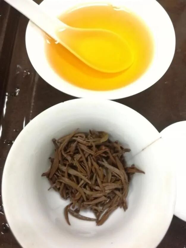 沸水冲泡后,正宗金骏眉的汤色应该呈金黄色,并且晶莹剔透,清澈透亮,即便茶放多了,闷一下,也是红汤带金圈。金黄色的汤,看起来都十分诱人,而仿制版本的多为红浓、红艳的茶汤。
