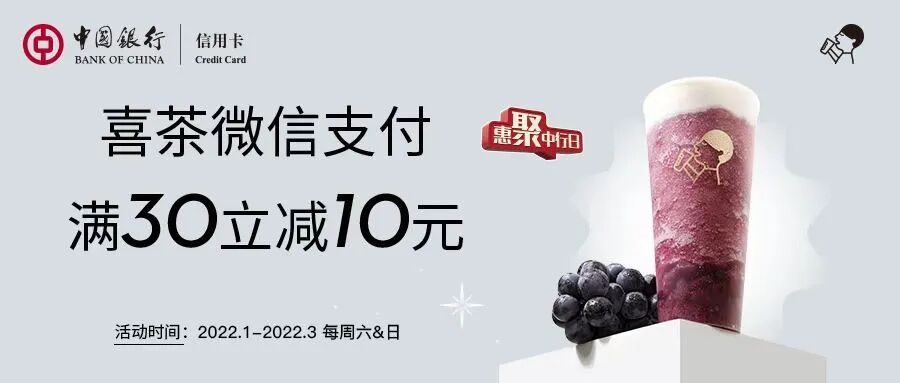 活动期间,每周六、日在喜茶门店或“喜茶GO”小程序消费,通过支付选择中国银行信用卡支付,有机会享满30元立减10元优惠,单笔优惠封顶10元,同一用户每个自然月可享2次优惠。每活动日名额4000个,用完即止。