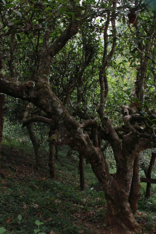 右:南糯山800多年的“茶王树”有着粗壮虬曲的枝干