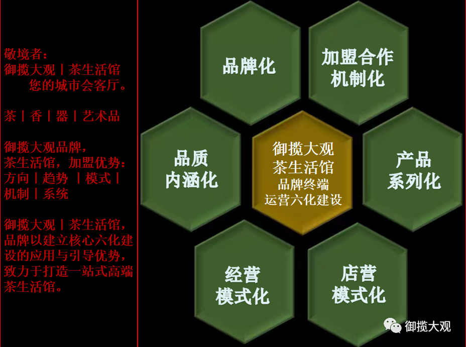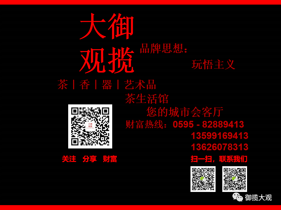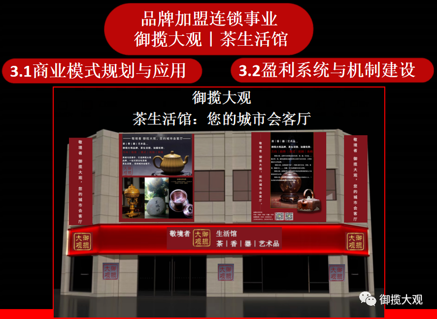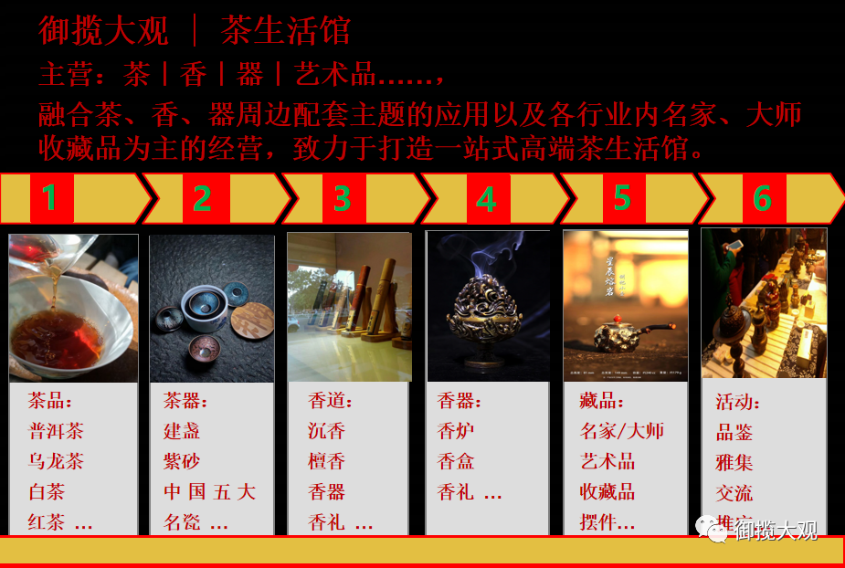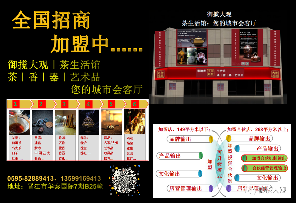 ▲品牌定位:御揽大观,致力于打造成为最具符合社会主流成功人士,一站式综合性高端茶生活馆的品牌,全国招商加盟进行中......。