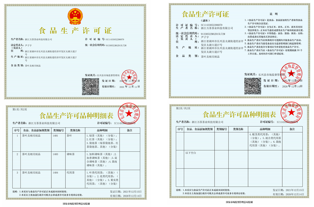 工厂生产资质齐全,证照的经营范围包括:原叶茶分装,花草及代用茶拼配和分装,调味茶生产、拼配及分装,能够满足各种客户的需求。