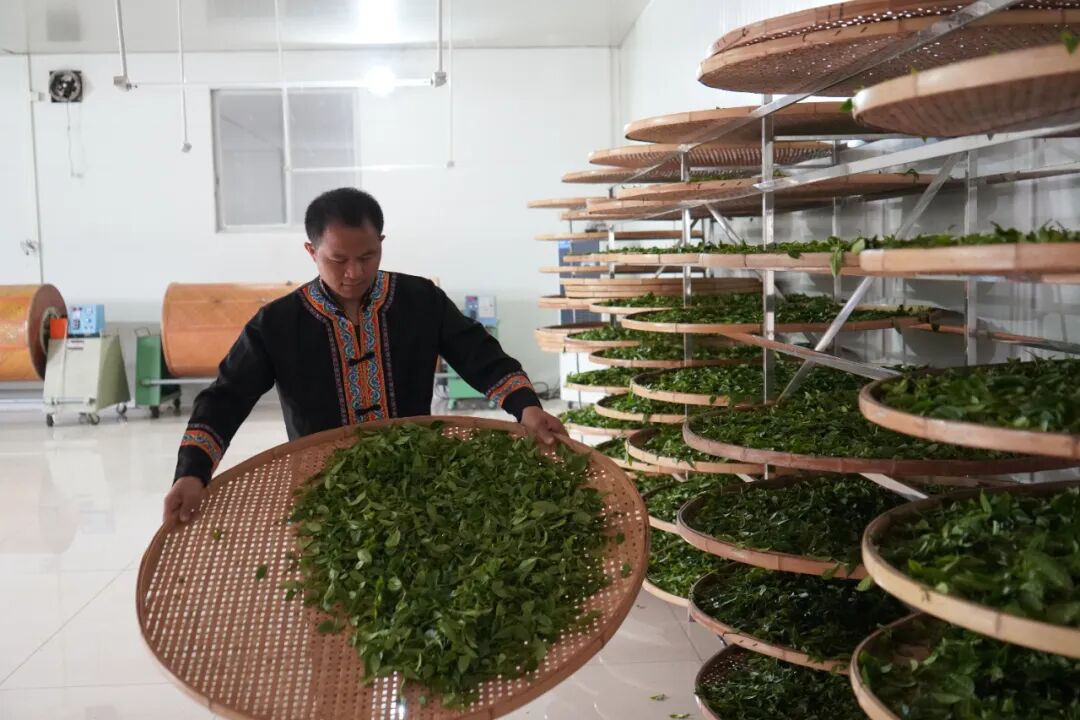 目前我们合作社种茶800亩,年产干茶10000多斤,产值可达100多万,带动周边村民80余人劳动,并通过向村民提供一些茶苗和种植技术指导,再向他们收购茶青,增加当地群众的收入。我们基地打算发展茶园观光旅游业,让前来的旅客穿上我们下帅乡壮族、瑶族的民族服饰,到茶园采茶、制茶、品茶,以茶带旅,促进当地发展。